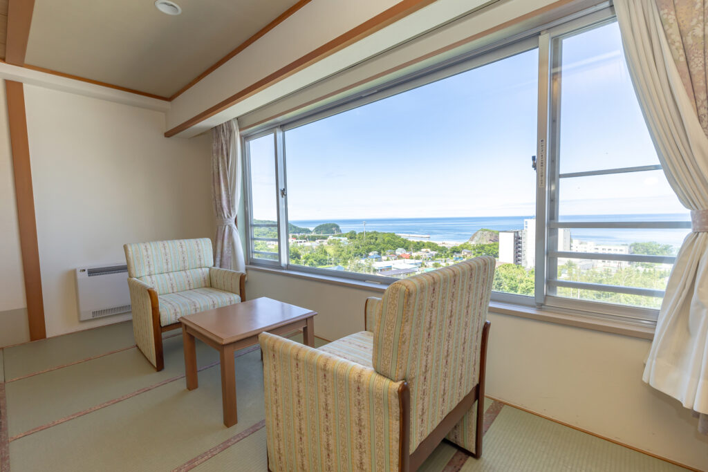 정면에 시레토코의 구릉지, 바로 오른손에 웅대한 오호츠크해를 바라는 미경의 방